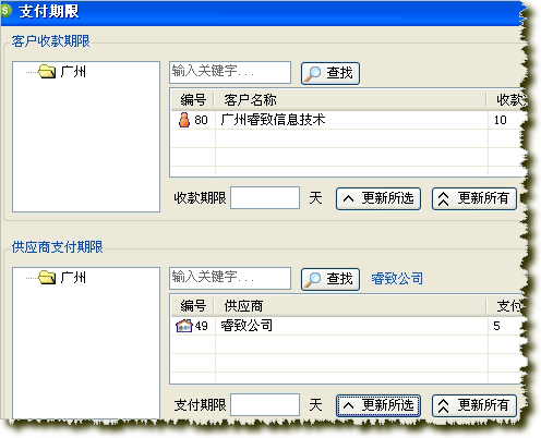 管理客户付款期限,供应商的支付期限,支付期限可以用来查询超期没有付款的客户和超期没有支付给供应商的货款。
