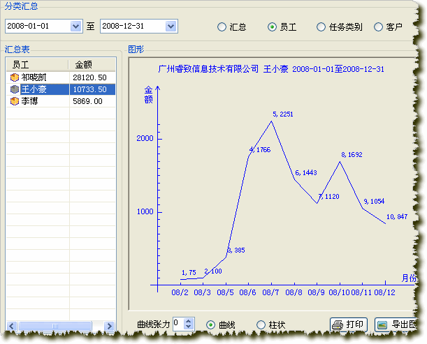 可根据,员工、业务类别、客户等分别进行数据分析,自动生成曲线图和柱状图。可根据一段时间内的业绩生成相应的曲线图和柱状图